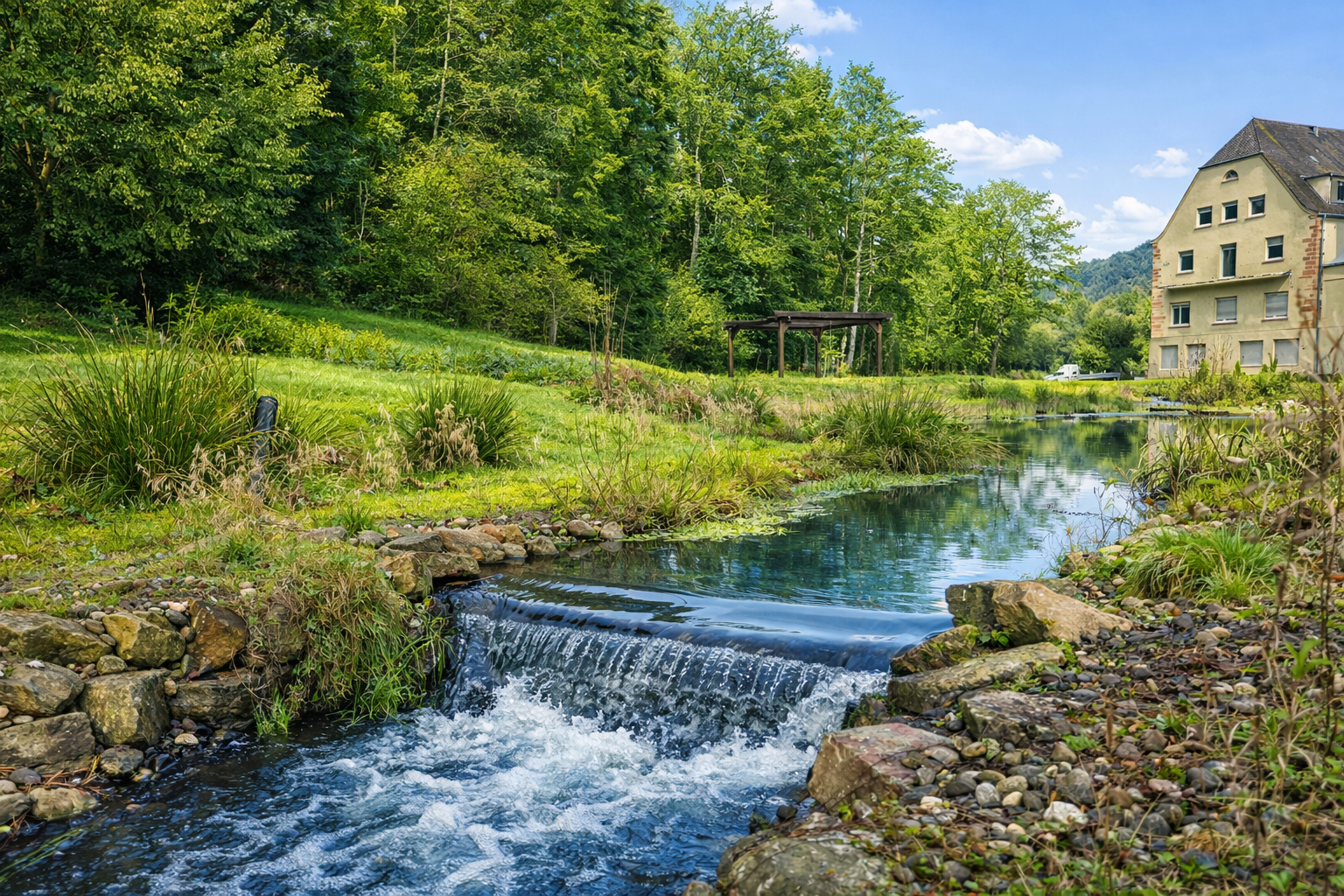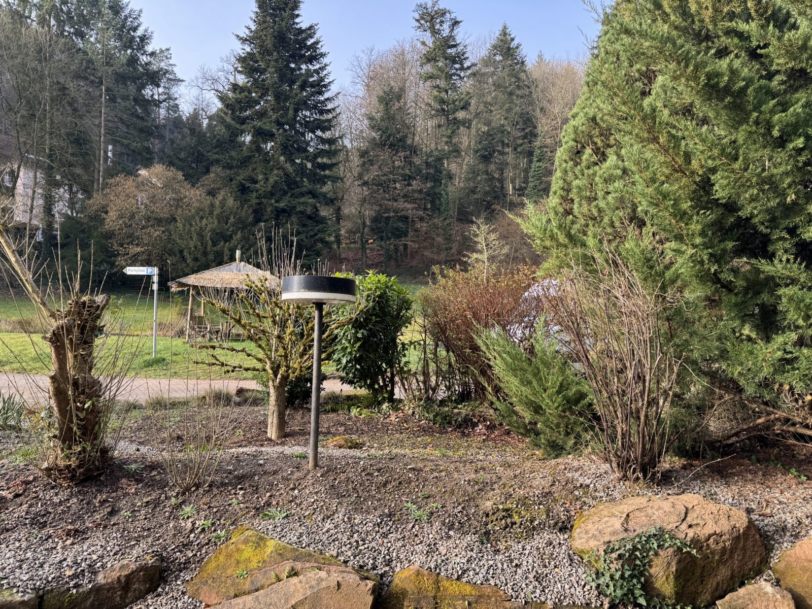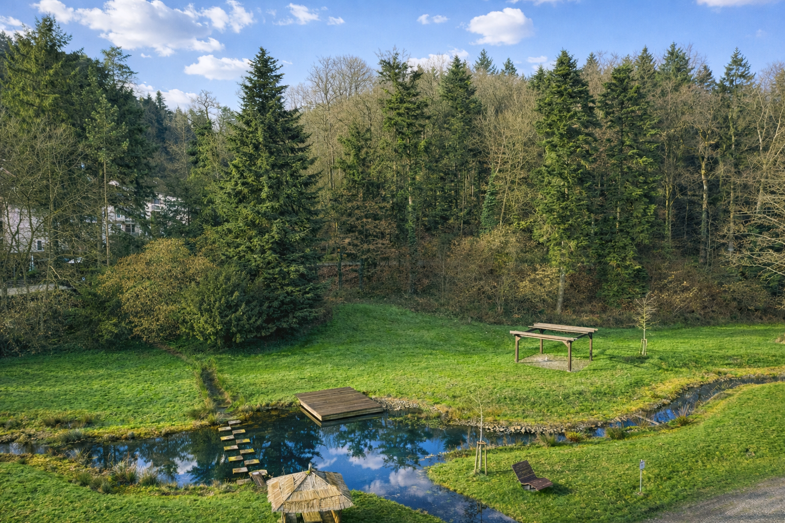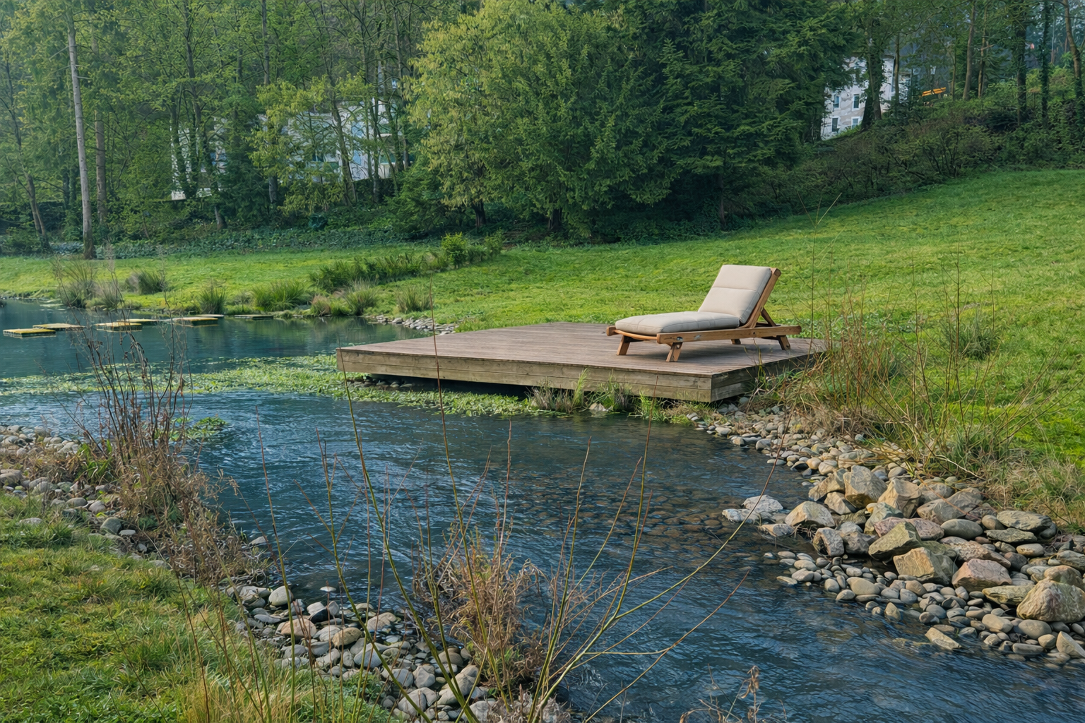 Der hauseigene Park, Vogelstimmen und sanftes Wasserplätschern – einfach durchatmen und zur Ruhe kommen.